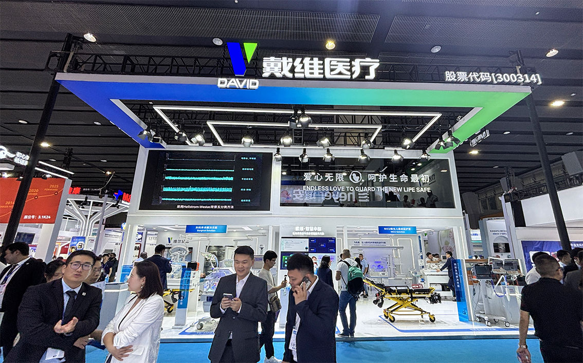 本次展會,戴維醫(yī)療以“數(shù)智賦能,聚勢拓行”為主題,帶來7大產(chǎn)品展區(qū)、5大解決方案等創(chuàng)新成果。展臺設(shè)計上采用象征生命與活力的藍(lán)綠色光帶環(huán)繞的形式,與“愛心無限,呵護(hù)生命最初”的理念相呼應(yīng),在一在一眾展位中呈現(xiàn)出新生命般的獨(dú)特視覺體驗(yàn)。