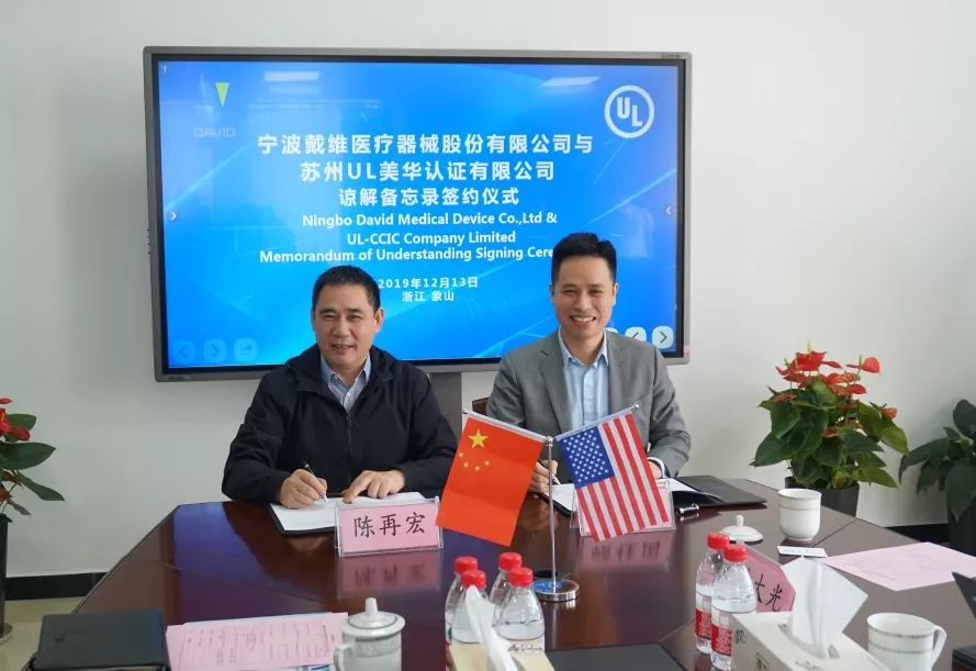 寧波戴維醫(yī)療器械股份有限公司總經(jīng)理陳再宏(左)與美國UL生命與健康科學部亞太區(qū)總經(jīng)理顧桂國(右)簽署合作諒解備忘錄